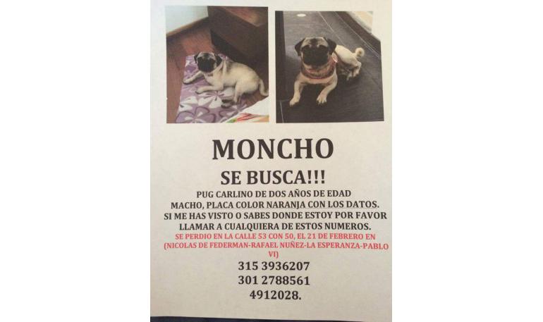 Moncho, carlino, macho, 2 años. Llevaba placa de color naranja con los datos.