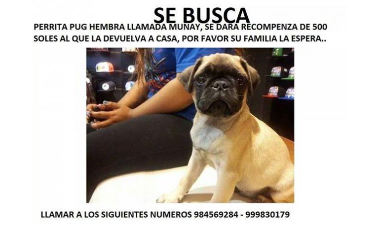 Se busca carlino hembra, Munay, 1 año, iba con un collar rojo. Necesita medicación.