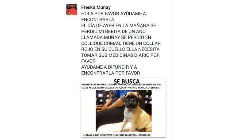 Se busca carlino hembra, Munay, 1 año, iba con un collar rojo. Necesita medicación.