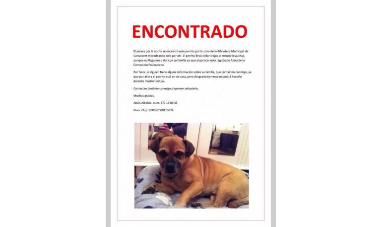 El perro llevaba un collar rojo, tiene chip (900062000113824) registrado fuera de la comunidad valenciana y no dan con sus dueños.